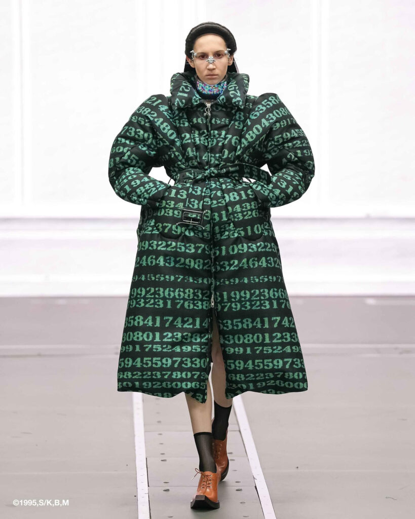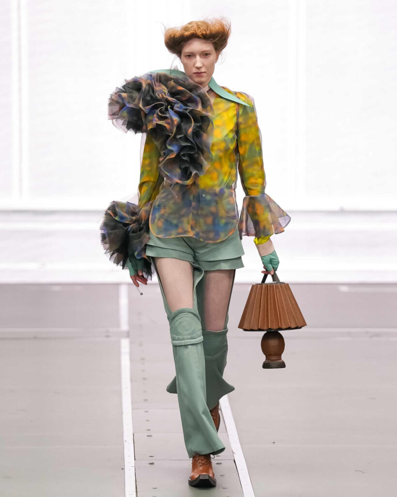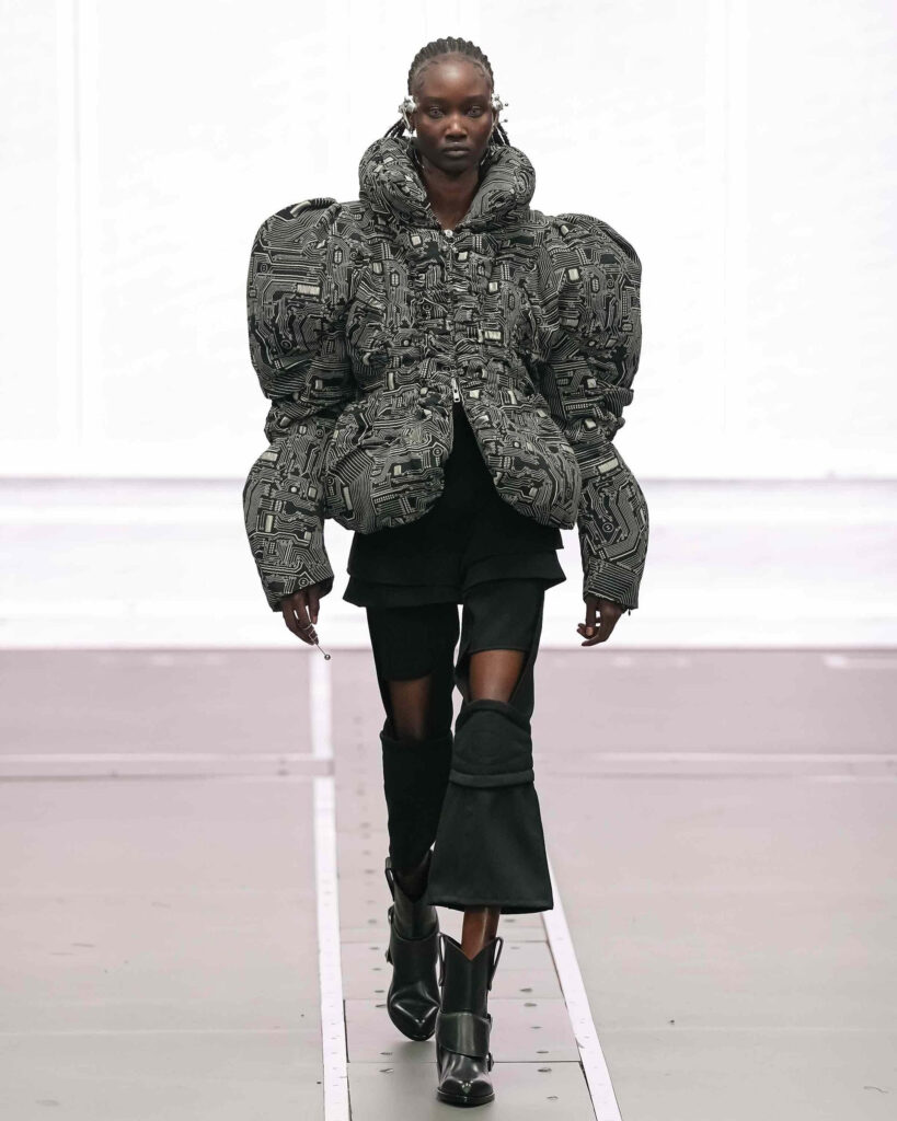In contrast, vivid looks emerge—psychedelic florals, voluminous silhouettes, and glam-rock distortions layered with futuristic precision. Fringe vibrates, LED surfaces pulse, and prints blur like fragmented data. Using KYOCERA’s FOREARTH system, watercolor-like textiles are produced with near-zero water, merging innovation with sustainability.