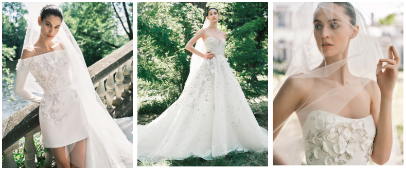 Material artistry and sumptuous detailing seamlessly blend into grand romantic gowns, gracefully evoking the majestic garden of Giverny that is in ETERNAL SPRING. Elegant satin blossoms gracefully unfold across faintly dipped strapless necklines, as small organza flowers bud into short skirts entwined with silver beaded leaves. Graceful lace flourishes off shoulders and into intricate diamond bouquet skirts, to meet with delicate eyelash trims. Echoes of earthly magic also move through sequins and silk thread embroidery, gently branching down ballet bodices to meet ponds of tulle.