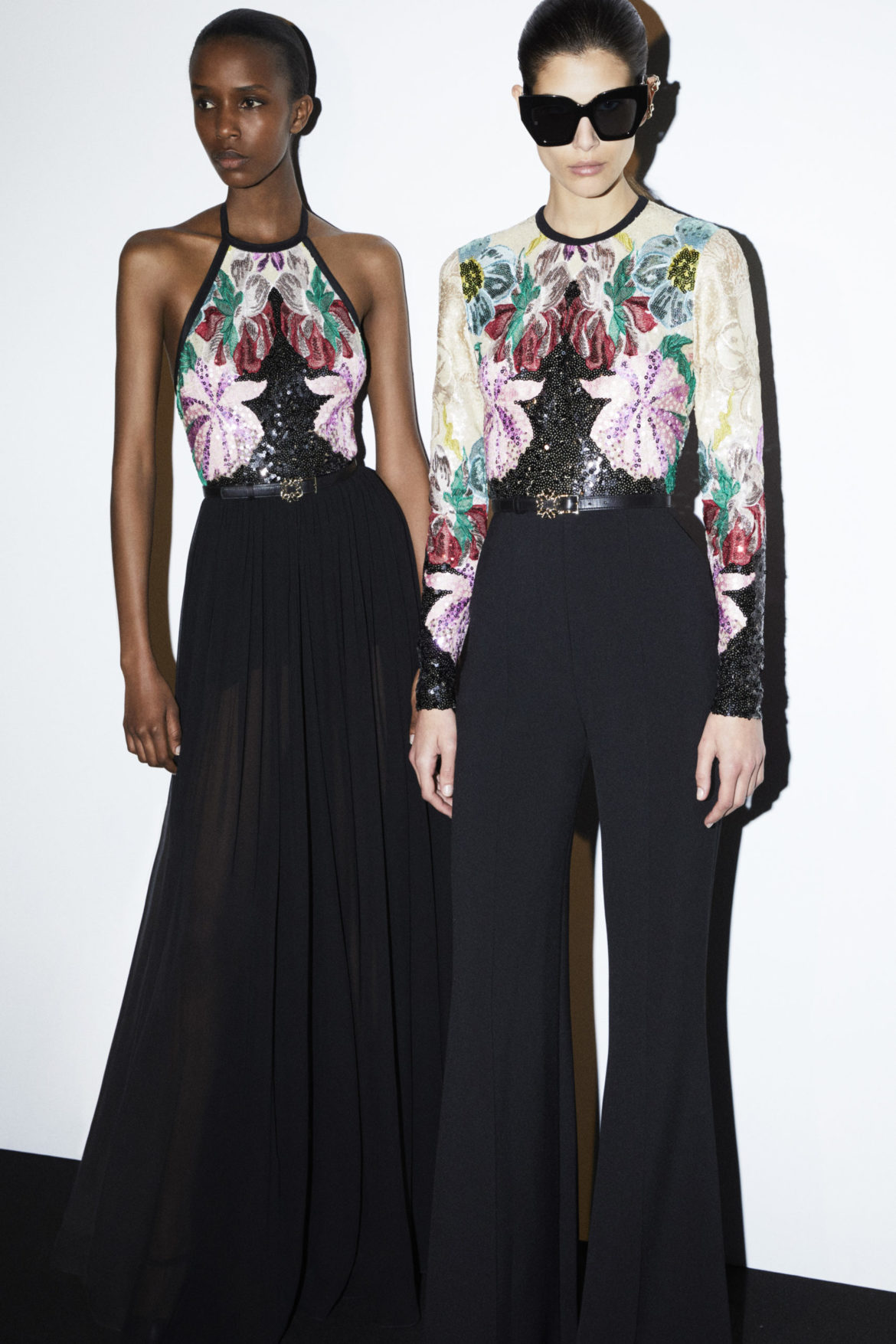 Warm metallic yarn-embroidered party rompers and beaded strapless midi dresses are illuminating. Moonshadow white crepe peplum tops and jackets bring a touch of playful feminine volume to more fitted contours. Midnight black jersey drapes into long dresses with high defined slits and scalloped plunging necklines finely outlined in glistening chain. Minimalist lines are emboldened in vibrant bursts of red tweed and Denver green crepe.