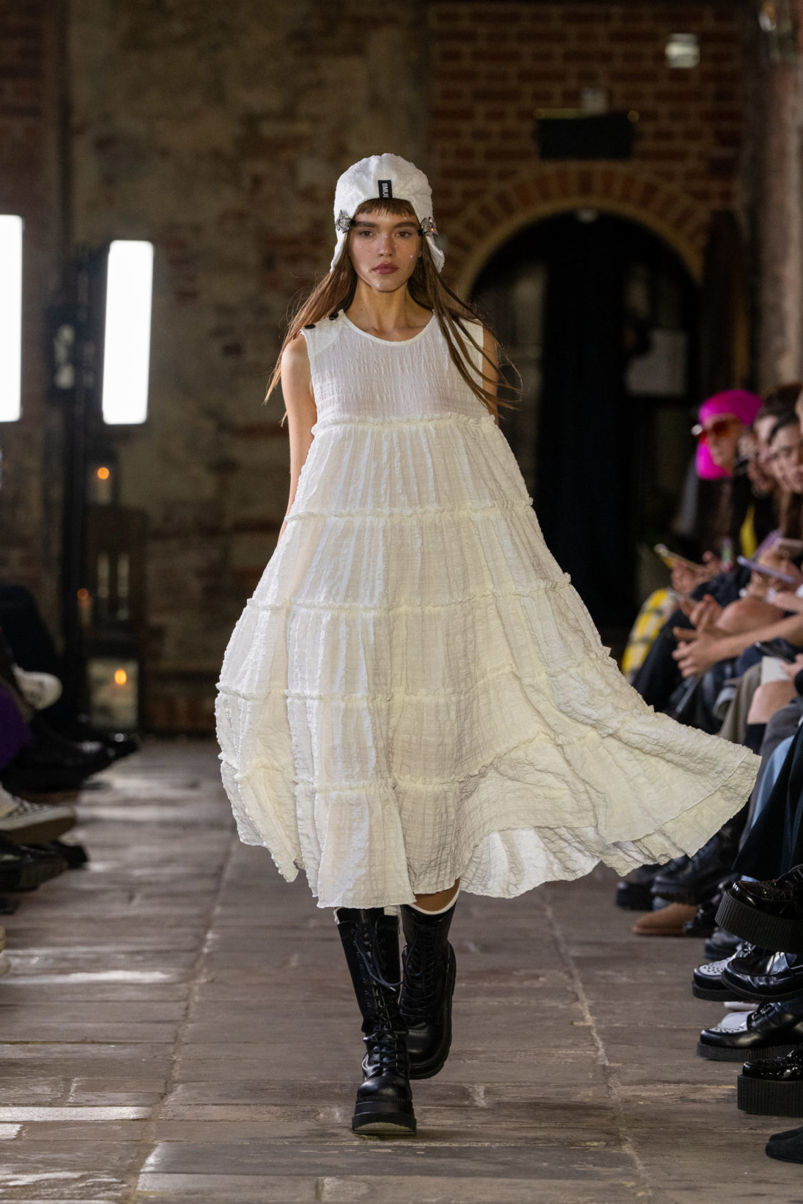 Expanding on its womenswear output, BMUET(TE) introduces T-shirt dresses, kilt-trouser hybrids, and denim. The design pairing exaggerates the hips of form-fitting dresses to offer unusual silhouettes, and cuts summer dresses and bubble skirts loose to mimic the shape of budding tulips, daisies, and poppies. Throughout, a delightful palette of purple, yellow and pink meets wrinkled textures in black and white for a collection that thrives on juxtapositions.