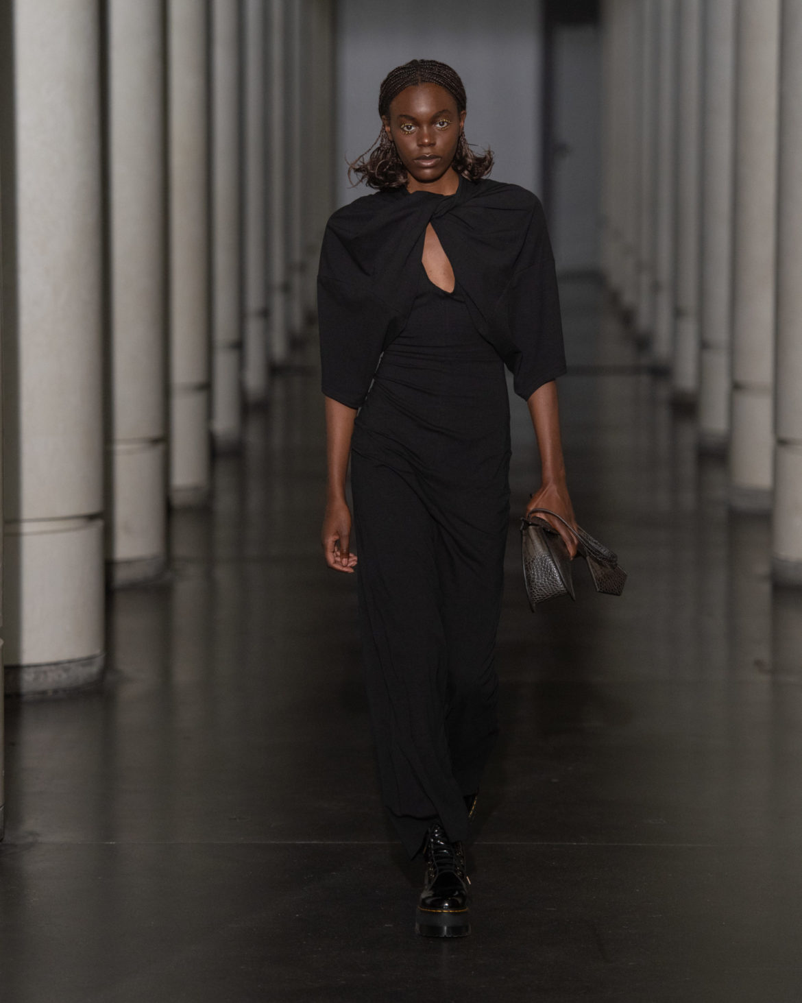 These questions and reflections inspired the Spring-Summer 2024 collection, which blends the codes of a nomadic society with relics of the past. Technical fabrics, old-fashioned pleats, sensual knots and drapes dialogue with vibrantly colored technological prints. The brand makes a point of using dead stock or recycled materials, offering a new life cycle to what others see as waste. In a dreamed (and fantasized) future, a new harmony would be possible between humans and nature. Technology will be used to understand and connect humans to other living organisms. These amplified humans will embody the creatures of a new world, which we hope, like butterflies, will emerge from their chrysalis to take flight in their new form, free and ethereal.