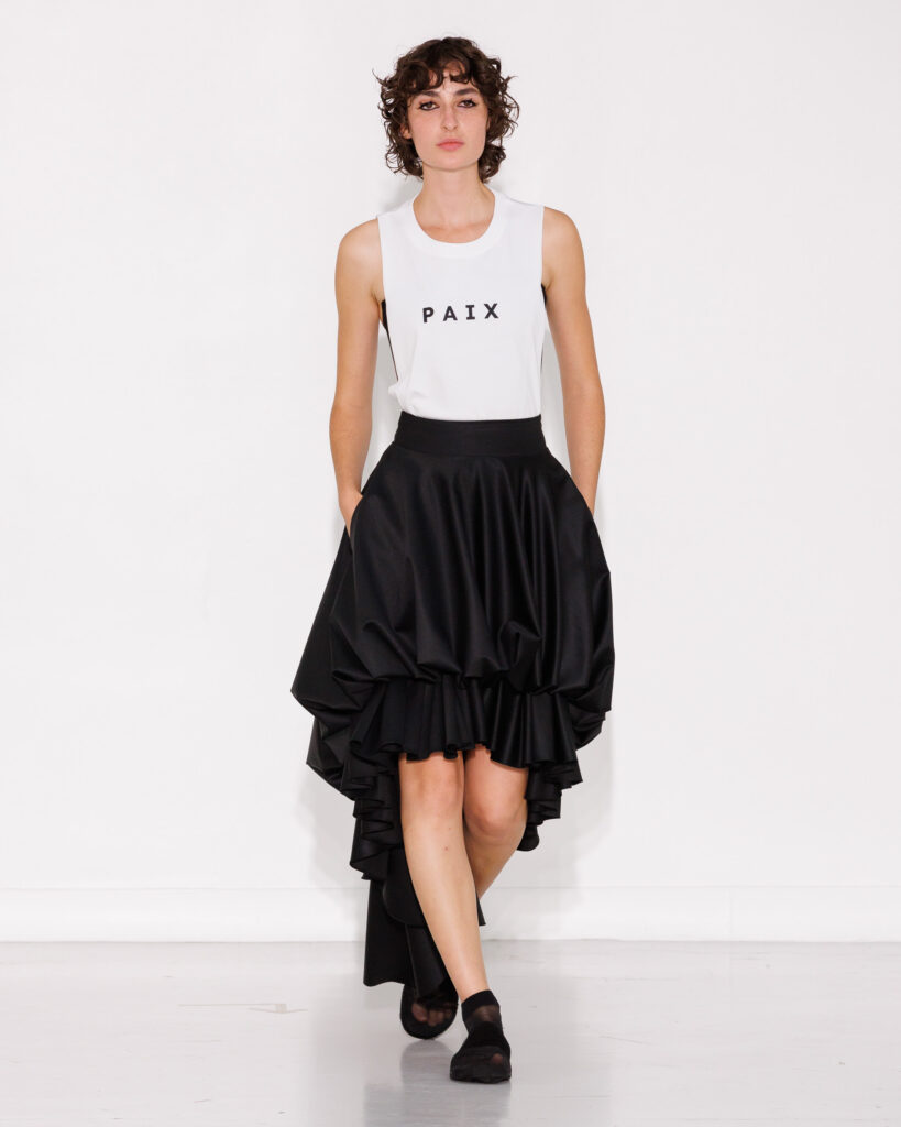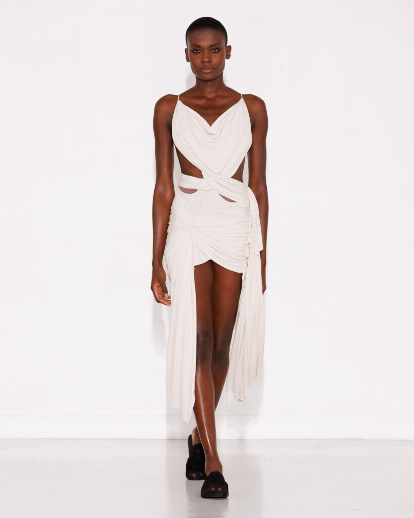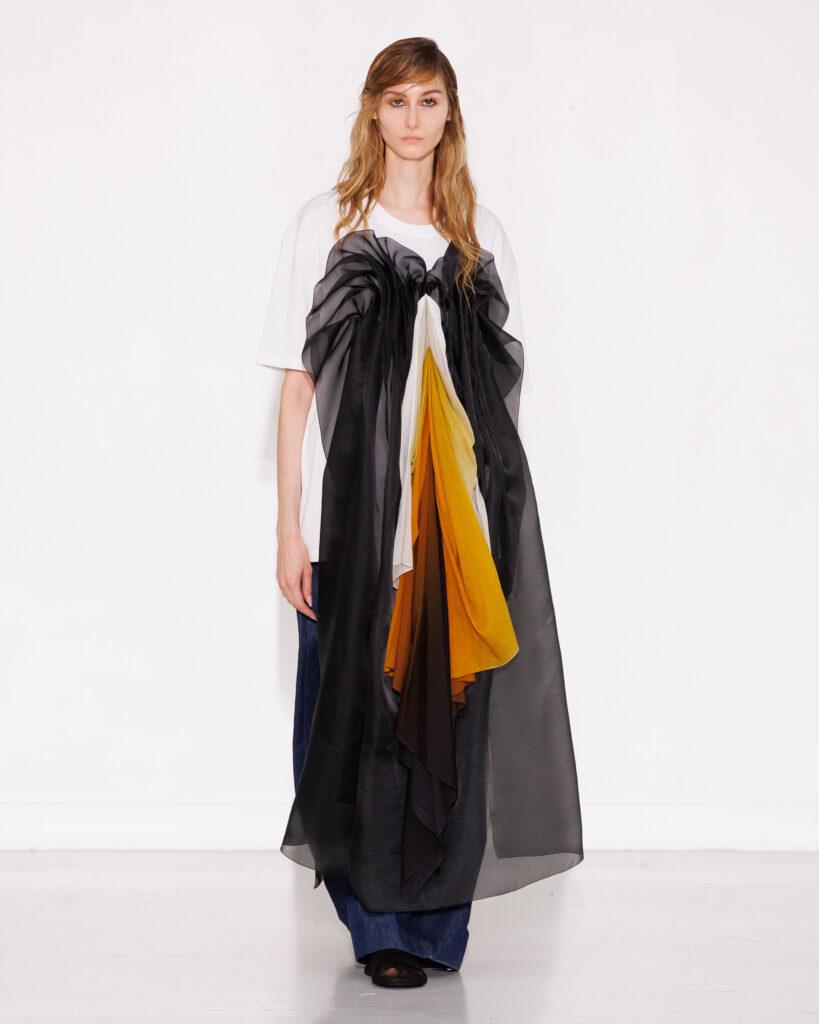 He explores layering and transparency as strata of memory that accumulate, reveal, and dissolve with movement. Airy draping, inspired by parasols, floats with grace, dances with the wind, and wraps the body like a poetic second skin. The collection also welcomes deep blacks, conceived as a poetic anchor through which Mossi Traoré expresses himself, and architectural volumes echo the cemetery’s mausoleums: a reminder that fashion at MOSSI is also an art of structure and building.