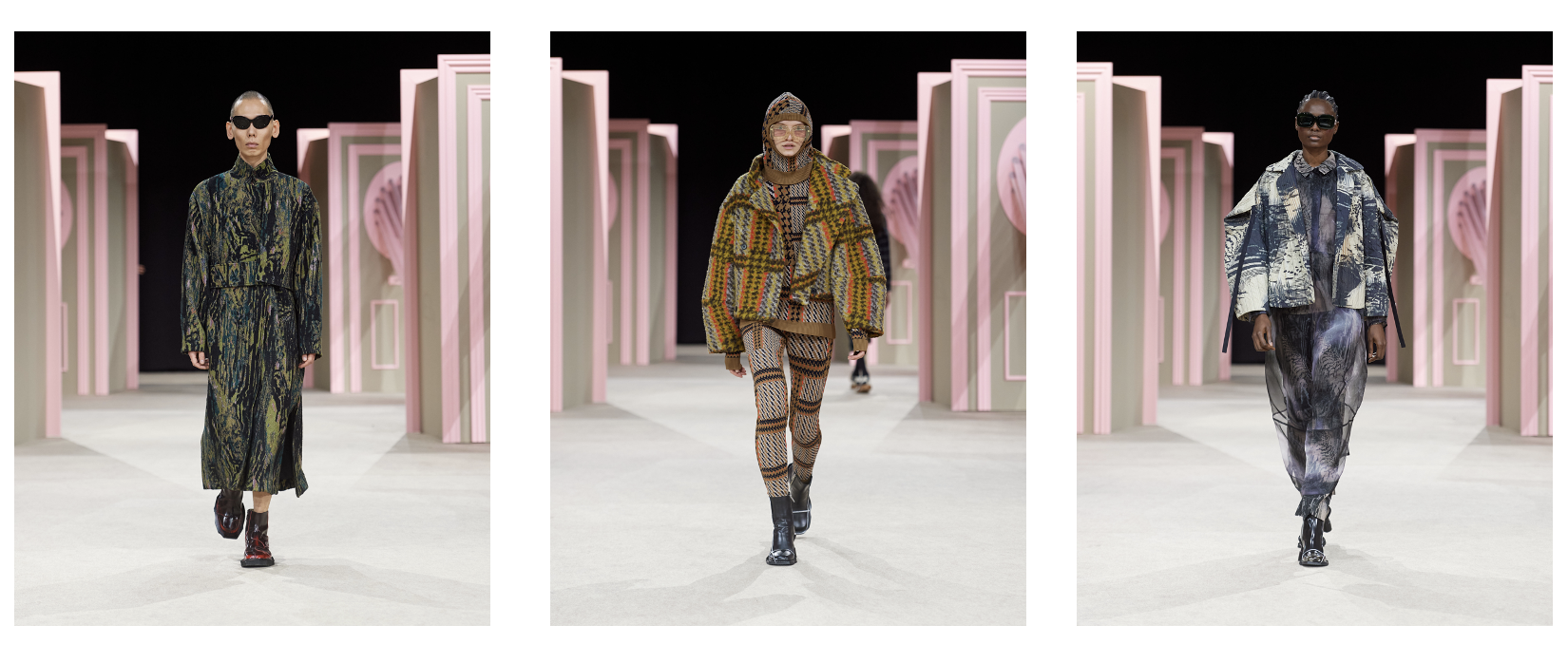 The installation is trying to create a dreamlike universe of chewy structure and rhythm that invites you for a moment of healing inspired by Henrik Vibskov’s own personal daily therapy fix – namely chewing gum. From a surreal row of doors on the Vibs therapy floor, performers pull exaggerated pink textile gum strings into soft horizontal pillars that the models have to maneuver their way around in a game-like manner.