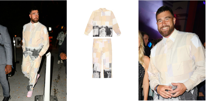 During his weekend at the Miami F1 Grand Prix, Kelce dons Look 3, known as the ‘Patchwork Set’. This selection from the spring 24 collection boasts patchwork construction and printed artwork paneling, showcasing KidSuper’s signature blend of streetwear and artistic innovation.