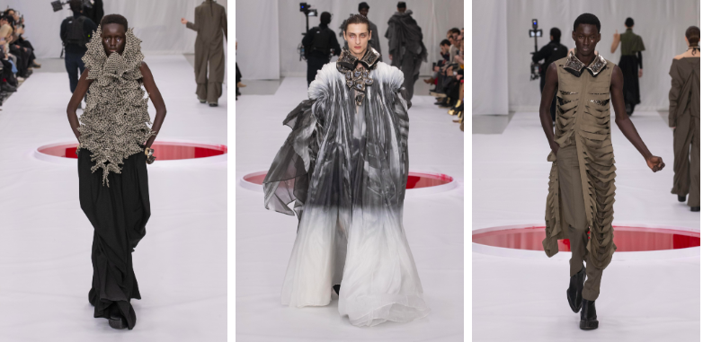 Through the contradictory existence of delicate, fragile armor created by textiles shredded and reclaimed from worn-out uniforms and workwear and decorated with ceramics, glass, and platinum, this collection shows the evolution of clothing that could have been otherwise. It is also an attempt to fuse the delicate and fragile handwork elements of couture with the evolutionary path followed by men’s clothing that has continued since ancient times. The fact that men appear on the stage of haute couture wearing these garments serves to embody our present era through its reexamination of the concept of toxic masculinity.